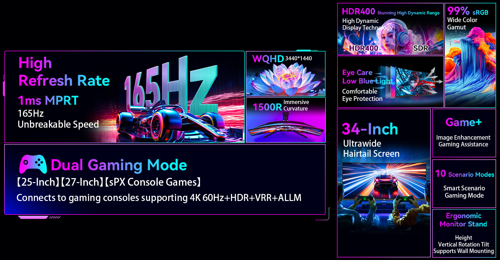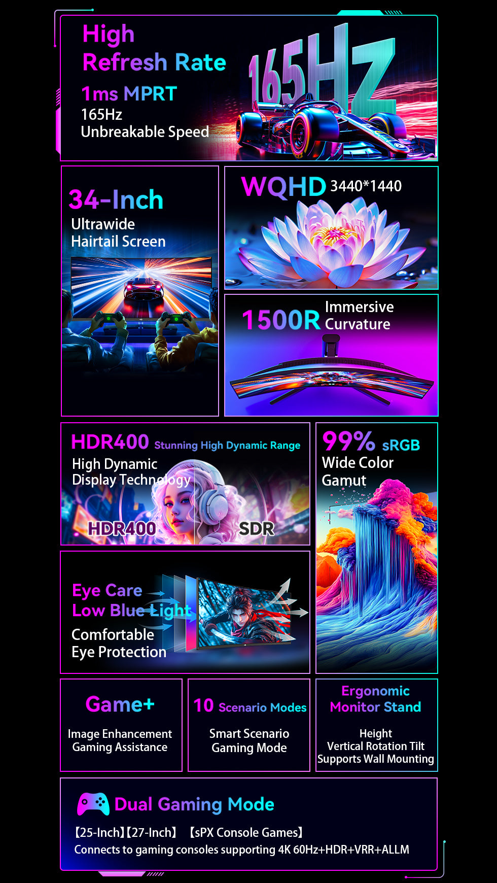 Ausgestattet mit einem ultrabreiten 34-Zoll-Bildschirm im 21:9-Format bietet er im Vergleich zu herkömmlichen 16:9-Monitoren eine um ein Drittel breitere Ansicht. Dies verbessert die Multitasking-Effizienz und bietet eine breitere Gaming-Ansicht. Das gebogene 1500R-Bildschirmdesign entspricht den natürlichen Sehgewohnheiten des menschlichen Auges und sorgt für ein umfassendes, immersives visuelles Erlebnis.