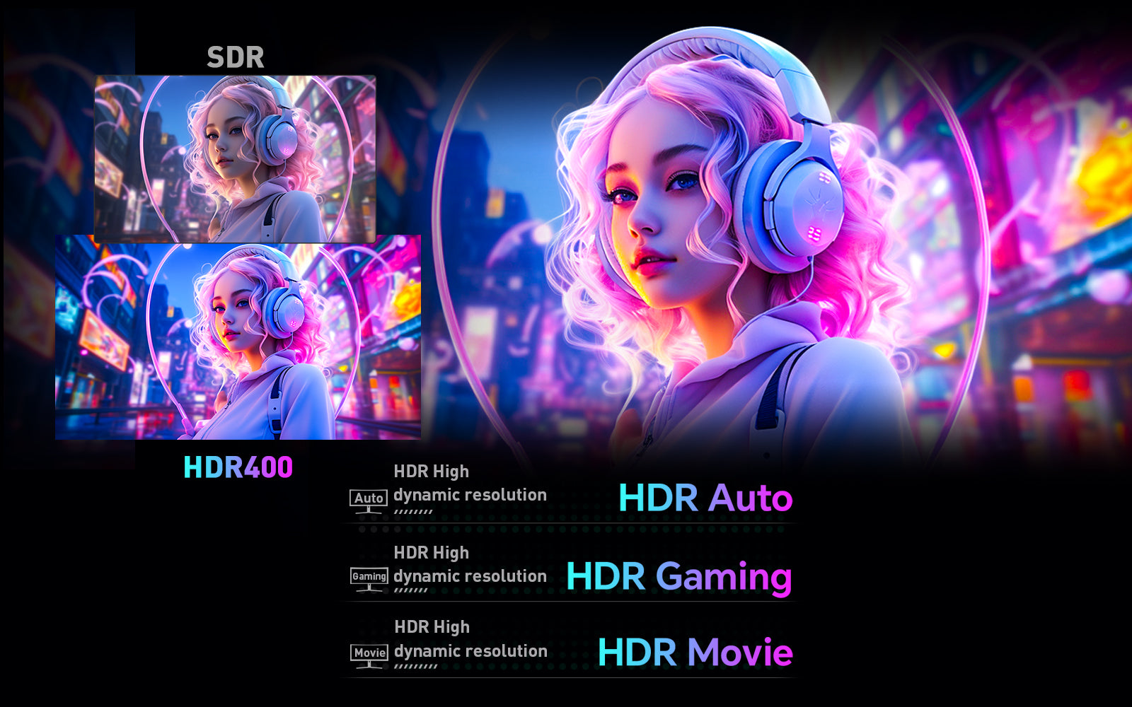 Durch die Unterstützung von HDR400 werden satte Licht- und Schattenebenen im Bild erzeugt, der Kontrast zwischen Hell und Dunkel verstärkt, sodass das Bild die reale Welt präzise wiedergibt und ein beeindruckendes und realistisches Erlebnis beim Ansehen von Filmen oder Spielen ermöglicht wird. Voreingestellte Modi für HDR Auto, HDR Gaming und HDR Movie.
