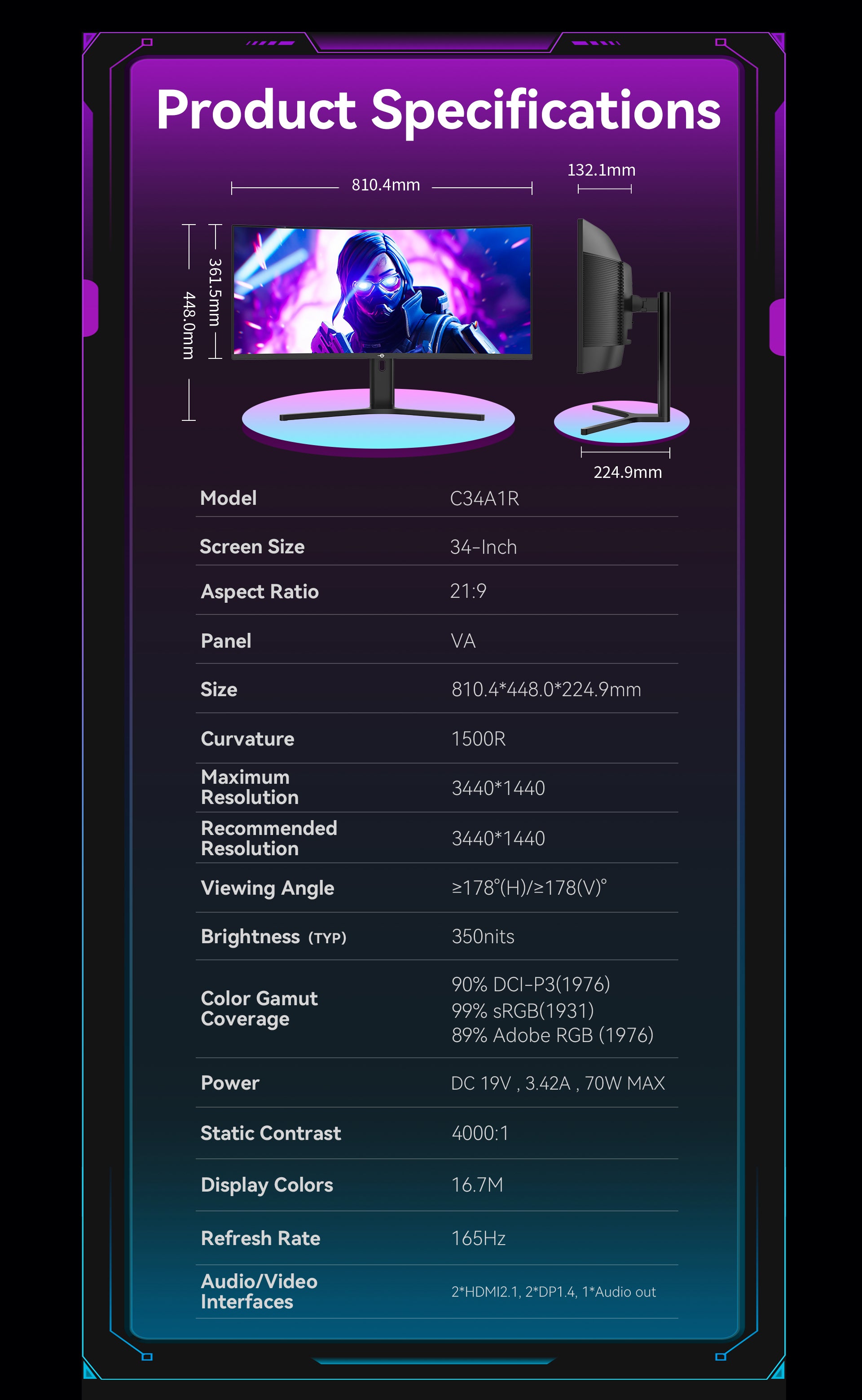 Der Titan Army C34A1R bietet eine beeindruckende WQHD-Auflösung von 3440x1440 und eine bemerkenswerte Klarheit von 109 PPI, die Filmkorn und Unschärfe mühelos beseitigt und scharfe, lebendige Bilder für Gaming, Videoansicht und Arbeit liefert. Mit 99% des sRGB-Farbraums und 16,7 Millionen Farben stellt dieser Gaming-Monitor wirklich lebensechte Farben dar und sorgt für ein intensiveres Erlebnis. Mit einem hohen Kontrast von 4000:1 und HDR400-Unterstützung werden mehr Details und eine verbesserte Bildqualität mit tieferen Schwarztönen und helleren Weißtönen hervorgehoben, was zu realistischeren Bildern und einem besseren Gesamterlebnis führt.