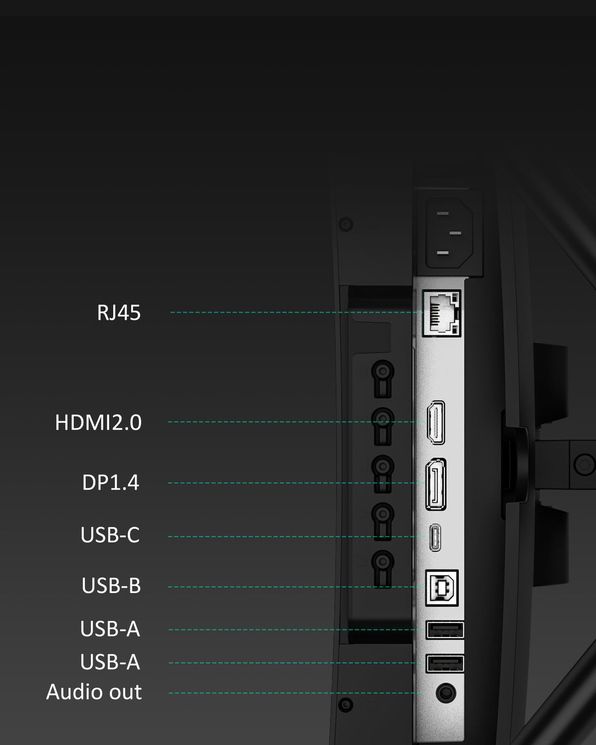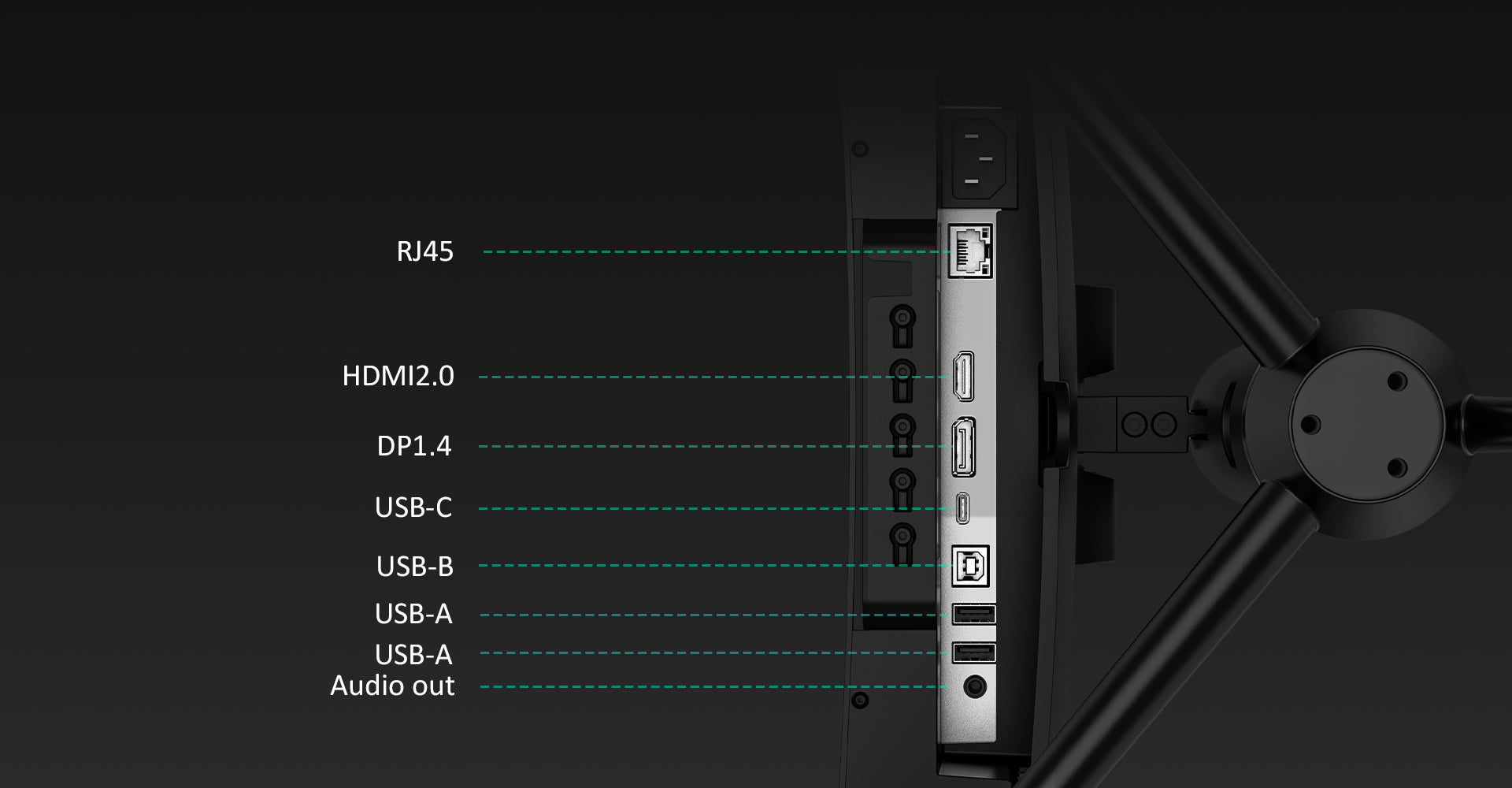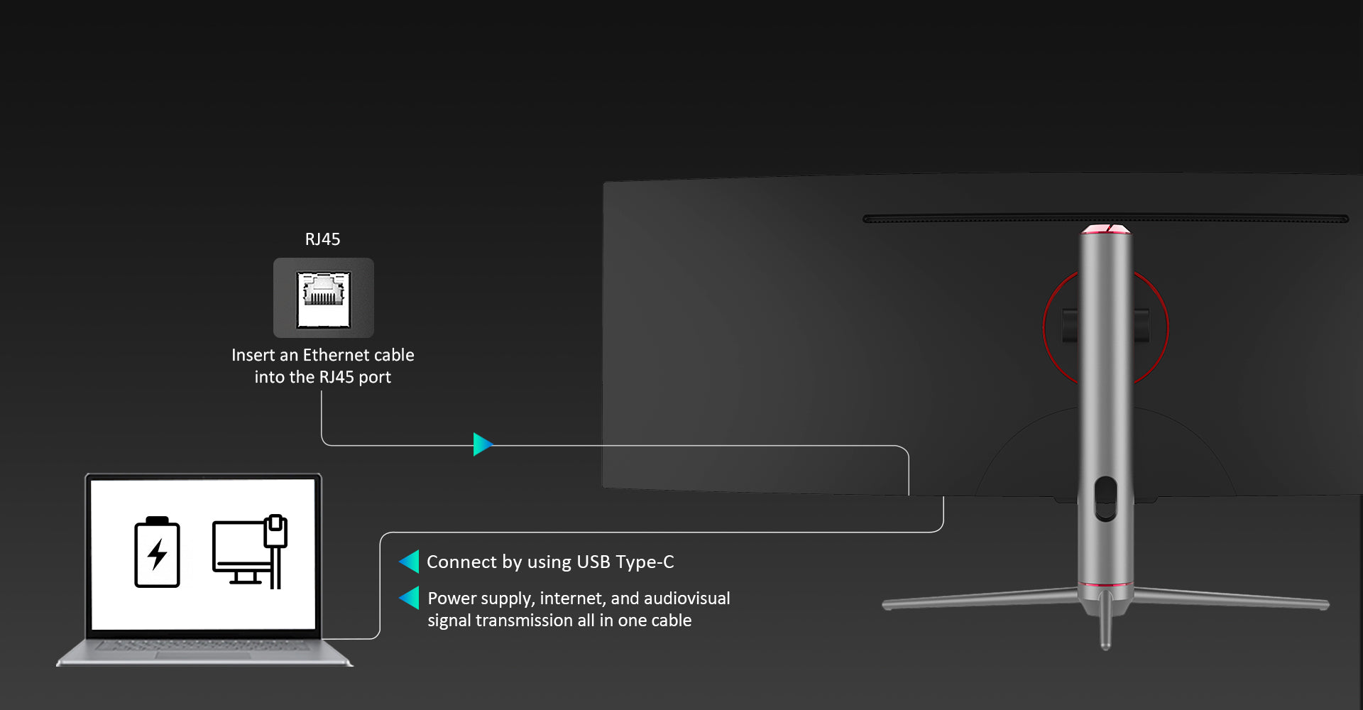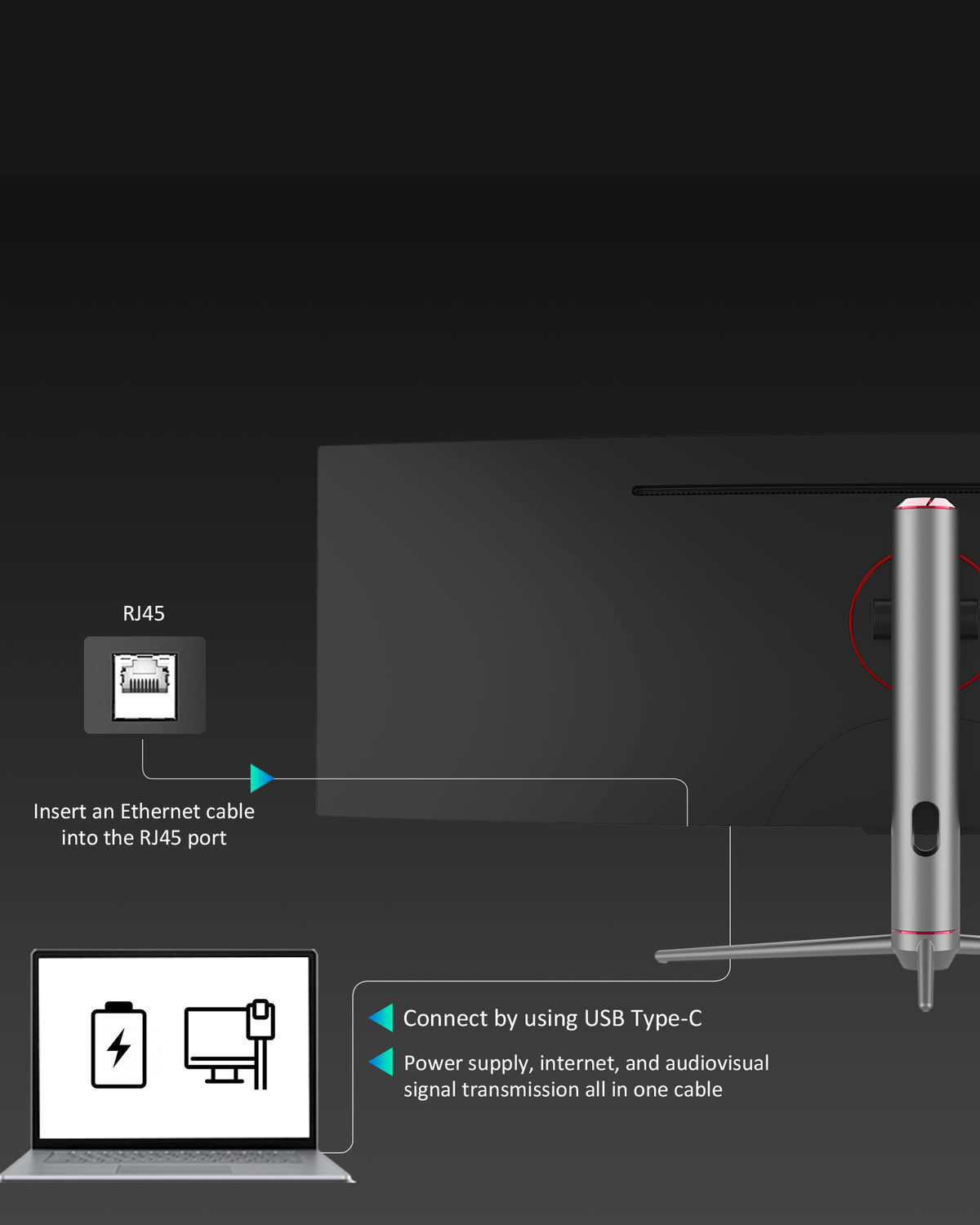 El monitor de juegos C49SHC ofrece una multitud de opciones de conectividad para los usuarios. No tienes que preocuparte por la fuente de alimentación, la conexión a la red o las transmisiones audiovisuales con un puerto Ethernet RJ45 y un puerto USB-C, donde el tipo-C proporciona 65W de carga rápida inversa. Las 2 interfaces más amplias, HDMI 2.0 y DP 1.4, crean varias opciones para la conectividad.
