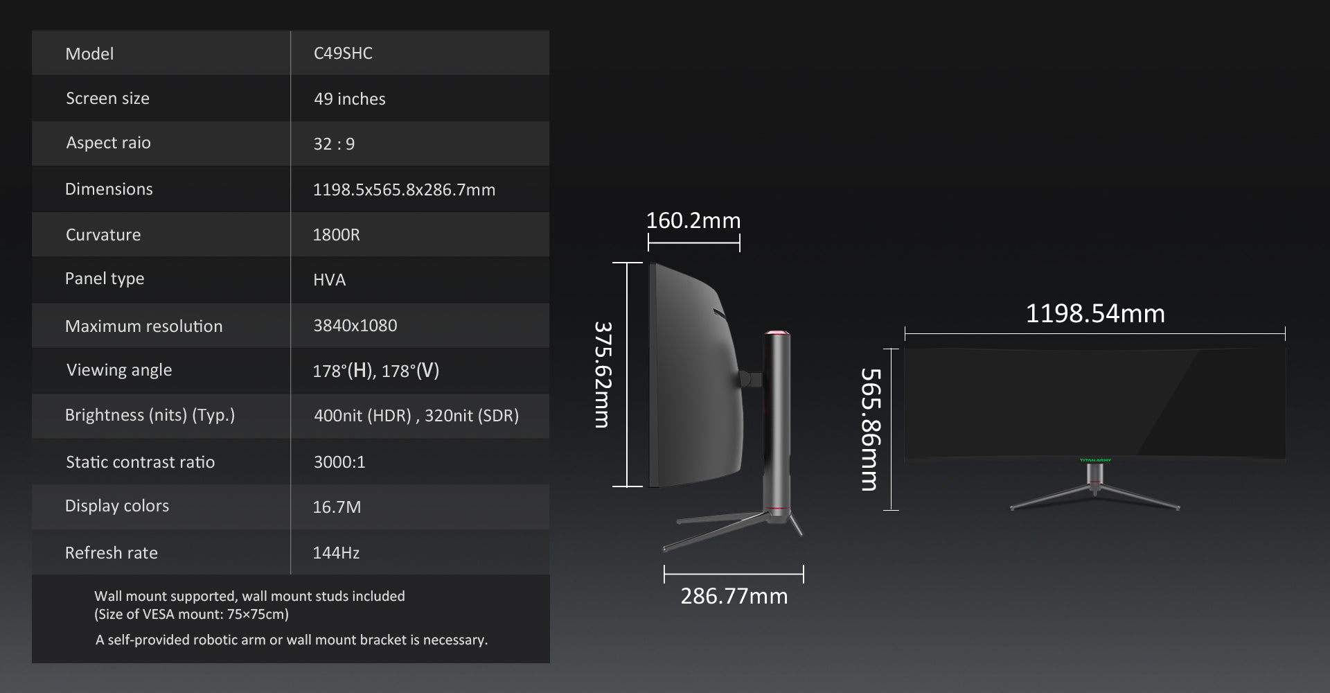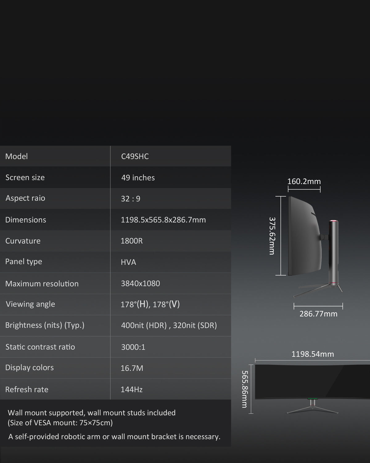 49 pulgadas丨3840x1080丨144Hz丨1ms丨HVA丨1800R