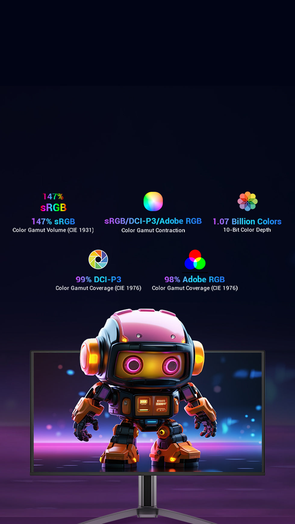 Color Gamut: 99% DCI-P3/1976, 99% sRGB/1931, 98% Adobe RGB/1976