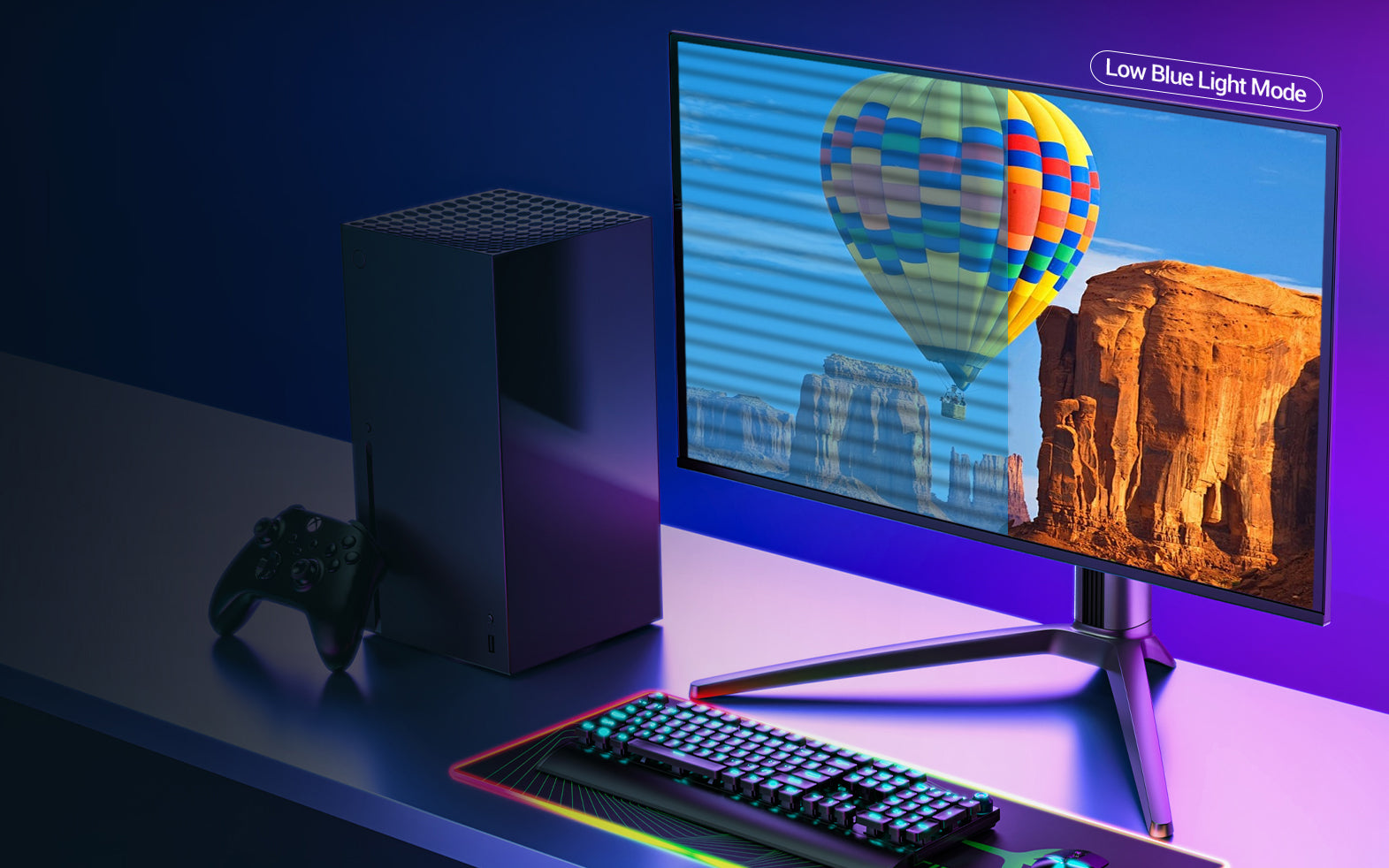 Elevate your gaming experience with vibrant ambient lighting that creates a dynamic atmosphere and offers high-quality personalized desk setup options.