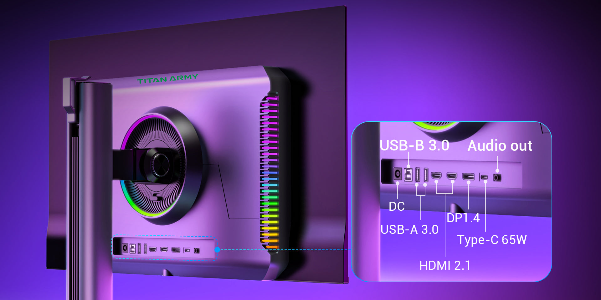 The Titan Army G27T8T features high-speed interfaces including DP1.4, USB-C, USB-A, and HDMI 2.1 ports for seamless connectivity and transmission. The USB-C port supports 65W charging, and the integrated USB HUB enhances connectivity options, while the KVM switch allows for quick, easy access to multiple computers or servers, adding convenience for a clutter-free setup.