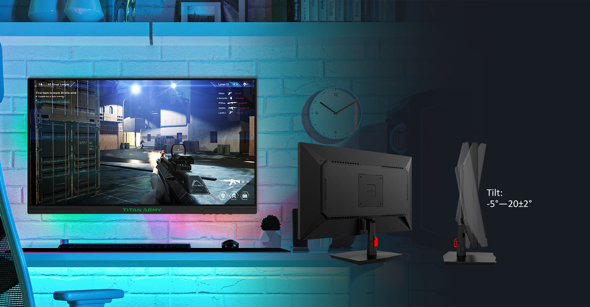 Customize your viewing experience with the monitor's eight preset scene modes, including RTS/RPG Battle Mode, MOBA Standard Mode, FPS Competitive Mode, and more. The adjustable tilt angle and wall-mount compatibility (VESA 100x100mm) offer flexible setup options for any gaming environment.