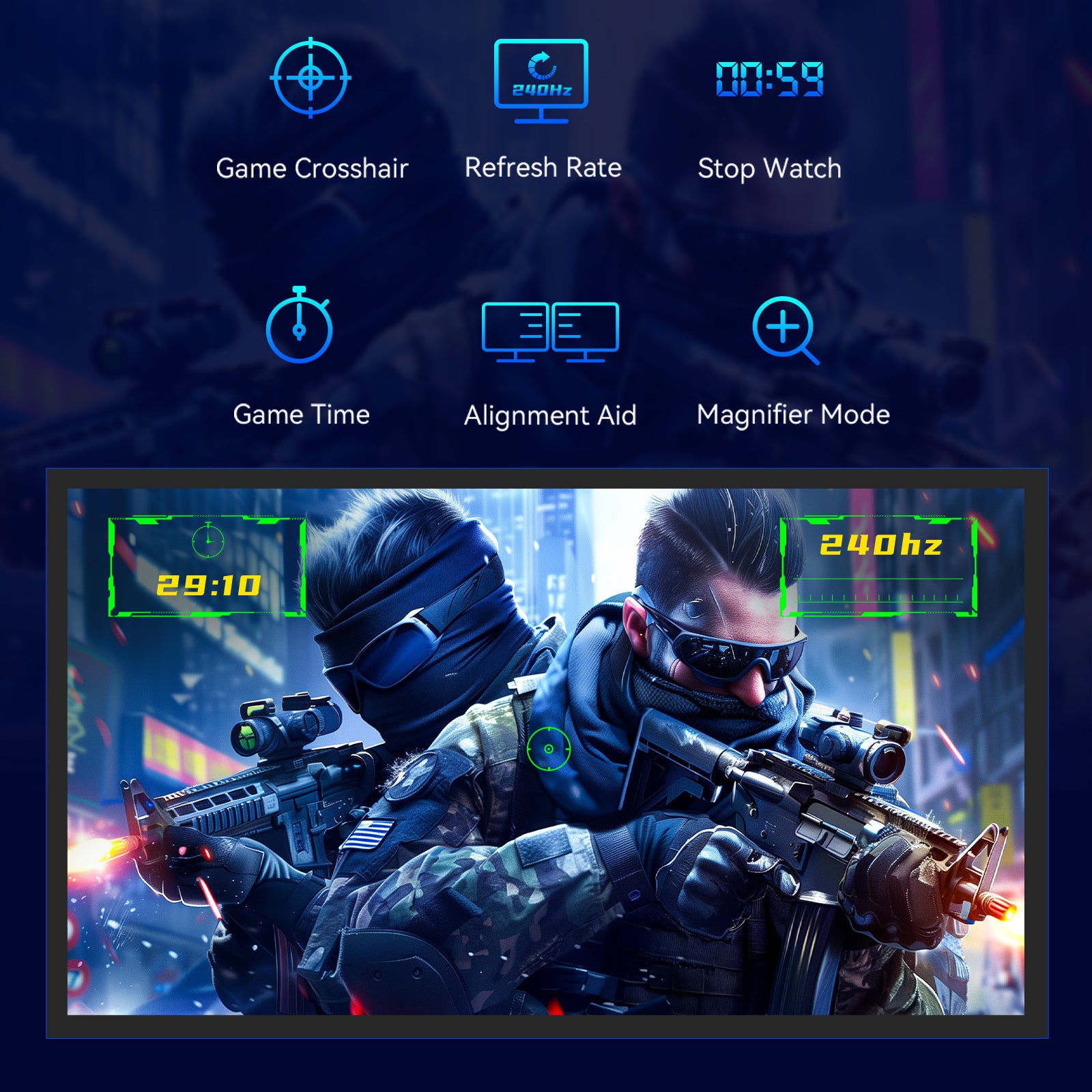 Customize your games with crosshairs, real-time timers, and advanced screen options.