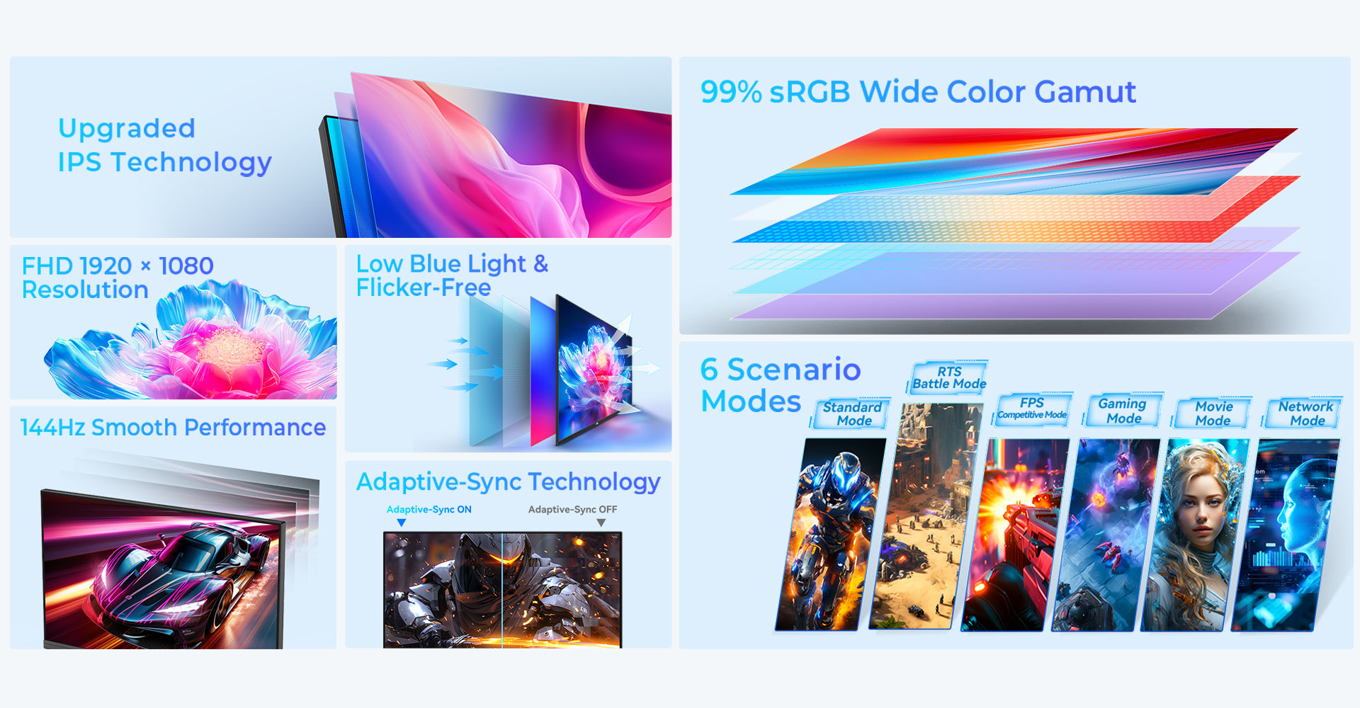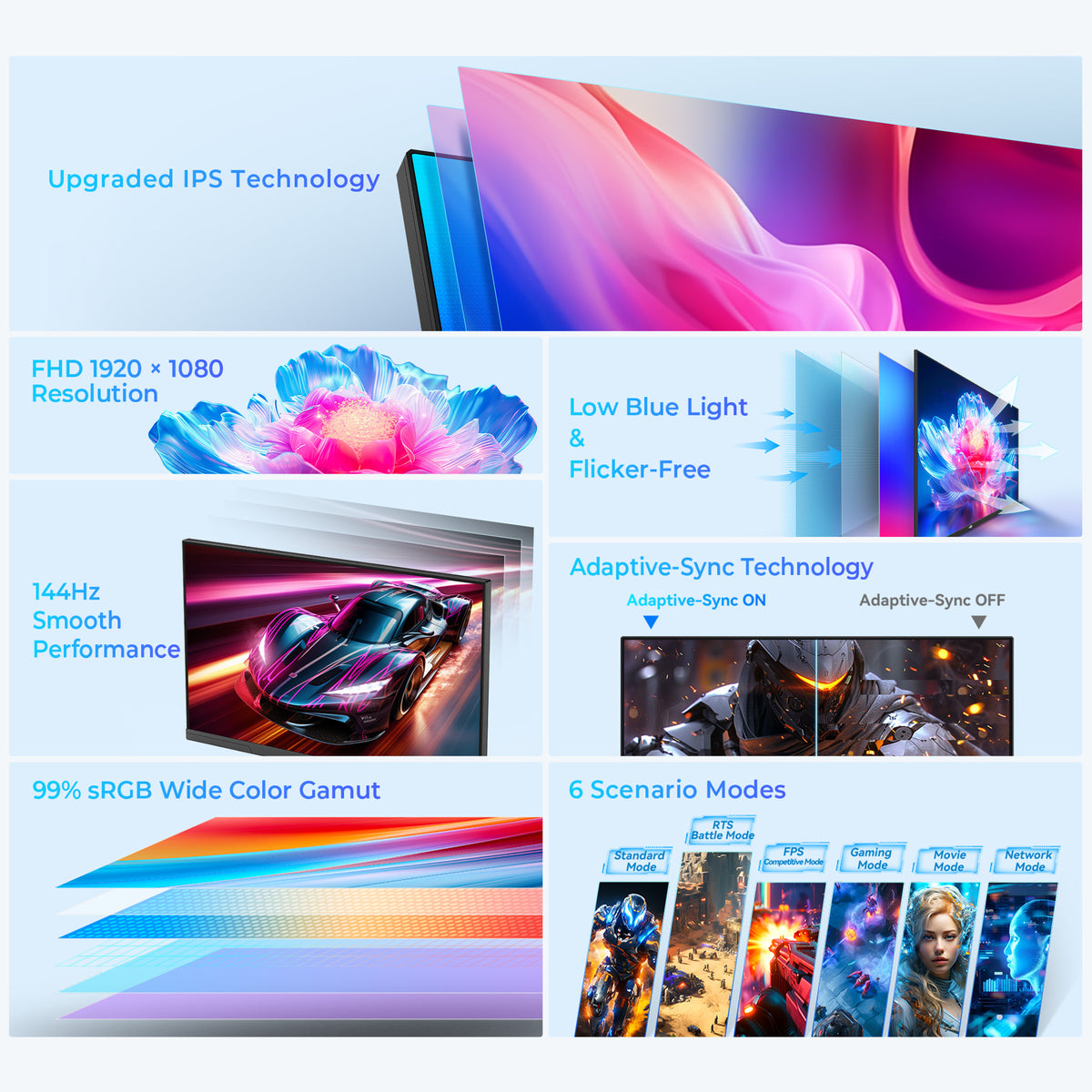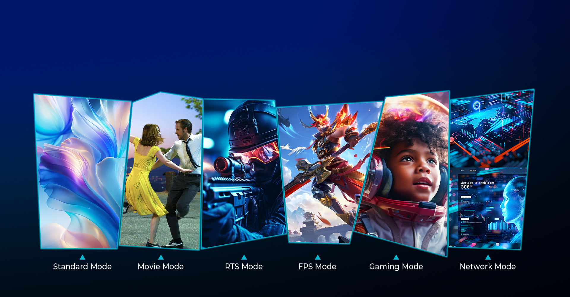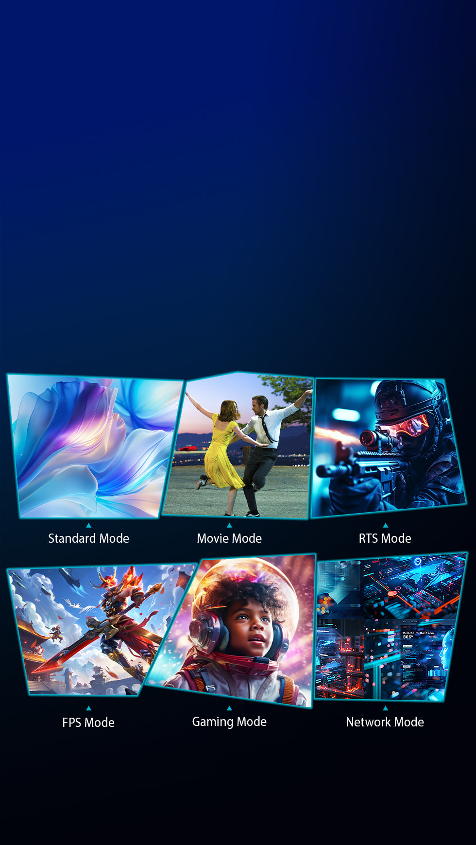 Instantly adjust your display to match different activities with six preset modes: FPS, RTS, Gaming, Movie, Network, and Standard. Each mode fine-tunes brightness, contrast, and color balance for an optimized experience, whether gaming, working, or streaming.