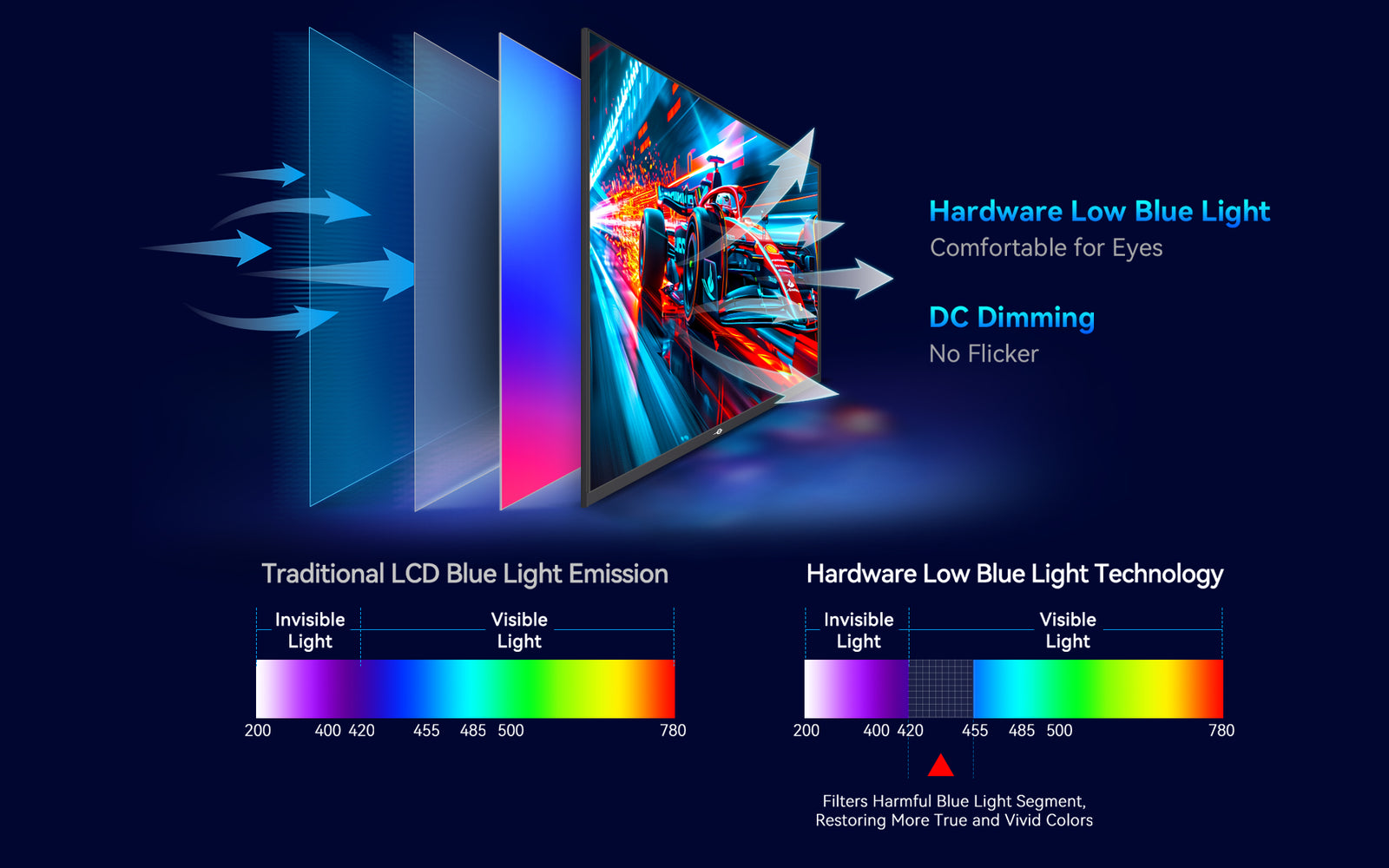 Combines Low Blue Light LEDs and software filtering to reduce harmful blue light, decreasing eye strain. DC Dimming Technology ensures a flicker-free, comfortable, and healthier viewing experience.